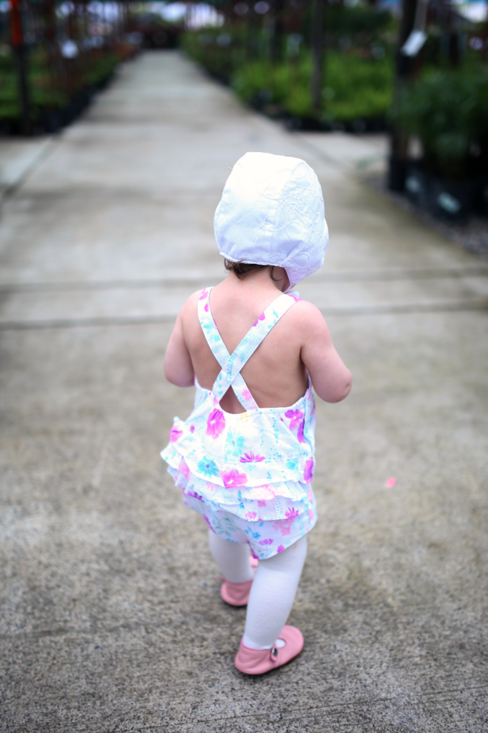 Now, in choosing her outfit for a trip to the nursery, naturally I needed something with flowers on it! Thankfully I had just stocked up on the cuuutest spring rompers from OshKosh B’gosh, and this particular one was begging to be worn. It was a cooler day, so I threw on some tights and a sweater for good measure! Oh, Spring! Warm and sunny one day, rainy and cool the next.