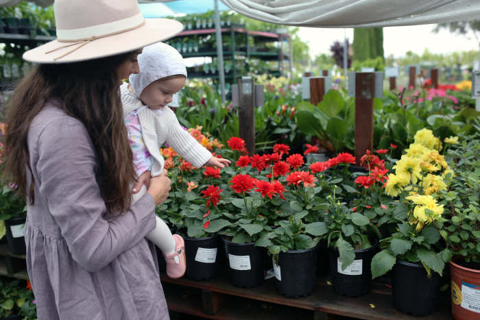 Let me tell you something about this little girl of mine: She LOVES flowers. Every time we pass any sort of flower (or if she sees anything that even remotely resembles a flower), she points to it and says, very matter-of-factly and quite intensely, “RO-RO” and will look you square in the eye until you follow her point and acknowledge that you do indeed also see the “ro-ro” (er… flower). It is the cutest thing, guys. Because of this, I refer to her often as my little flower girl, and this is why we decided to spend one afternoon last week at the local nursery, letting Sophie run free amongst the flowers. Sam was at school, so this was a special Mama/Daddy/Sophie date, and I have to say, she had the time of her life!